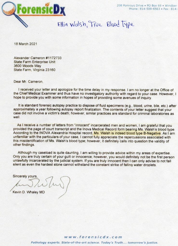 Moreover, and in light of Cameron, discovering Ellin Walsh’s, true B-Negative blood type, even if a DNA Test was conducted, exactly what blood type would the Commonwealth Attorney like to be representative of Ellin Walsh: It can’t be, “O” because, we now know the blood type of Ellin Walsh, is B-negative and can’t be B-negative, because the blood type of the record Cameron, is in prison pursuant to is: “O”.